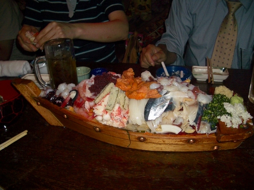 海鮮が食べたいと言ったら 必ず舟盛りがでてくる店(名前は忘れた)に連れて行ってくれた。 エレベーターを降りたら昔懐かしいお面やメンコ、ブロマイドが店中に飾ってあった。 えび、たこ、うに、かに、くじら、いか、つぶ、赤貝、ほたて、さば、他忘れた 根わさびを久しぶりに賞味した。 マイウ〜 でも全部食べきれなかった。 ごめんなさい(^∧^) |