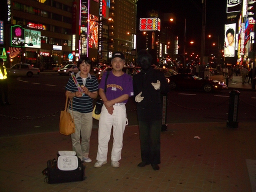すすきの4丁目の角で路上パフォーマンスをやっていた。一緒に写真を撮ろうとしたら逃げてゆく。左下のバッグにお金を入れないと撮らせてくれない。やっと一緒に撮ったが一部始終をテレビカメラに撮られていた(+。+)アチャー。 |