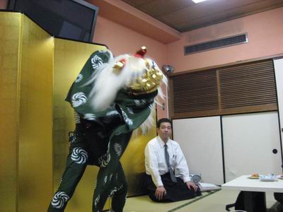 | 今回も獅子舞のサービス。 | 頭を噛まれると来年良いことがありますよ。 |
