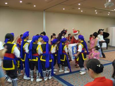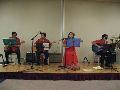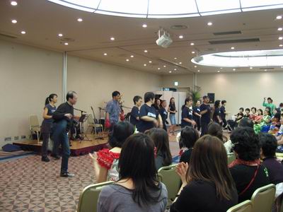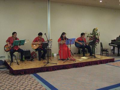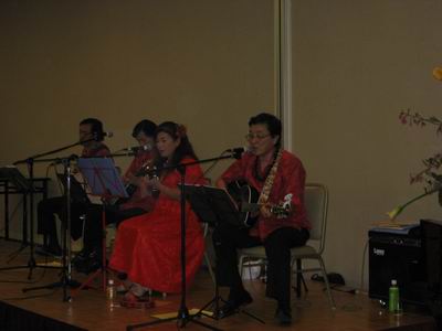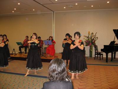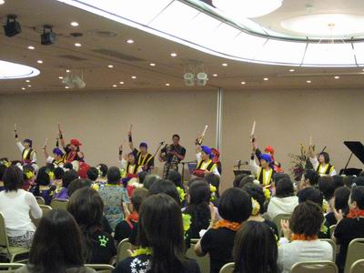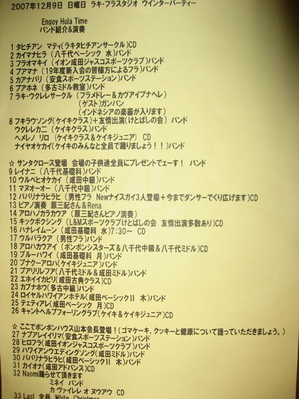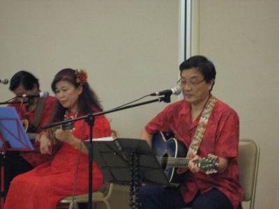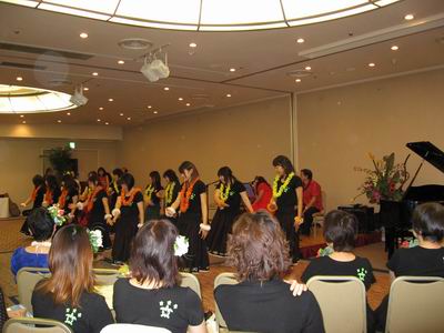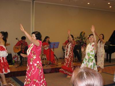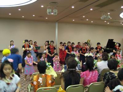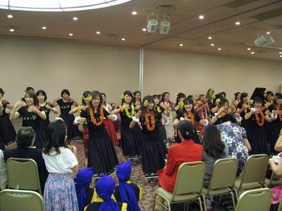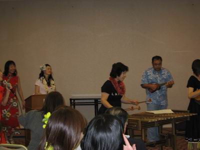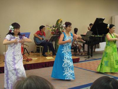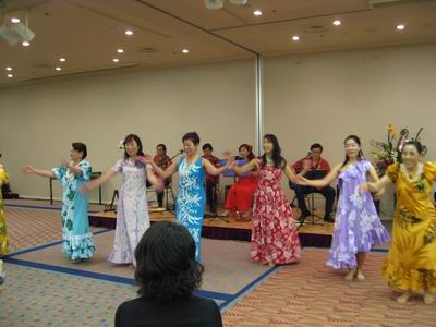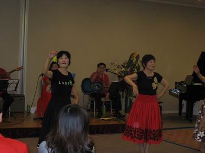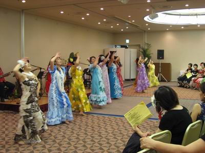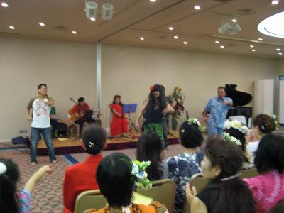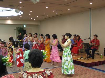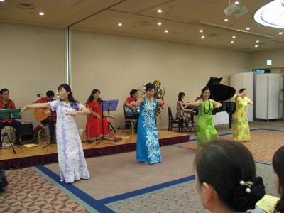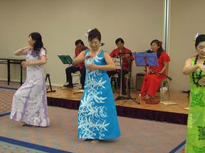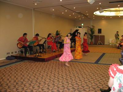 | タヒチアン。この音楽を聴くと「スパリゾートハワイアンズ」を思い出す。やっぱりココヤシはないか。 | 2.このグループは生のバンドで踊るのが初めてらしく、踊るタイミングがあわず結局CDをかけて踊ることになった。 |