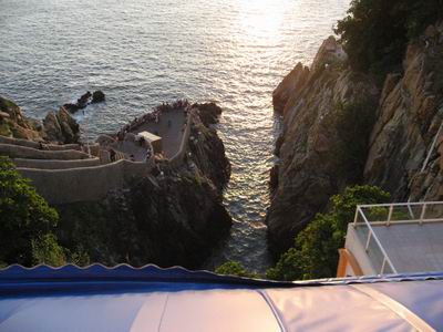 | 陽が落ちてライトアップされる。7〜8人の男たちが左の観覧席に現れ、海に飛び込んで右の崖(90度近い)をよじ登って行く。最初は崖の中断からダイビング。回転を入れたりして海へ飛び込む。最後に上段から(35mあるらしい)飛び込む。さすがにすごい迫力だった。 | ||