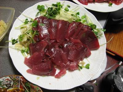 じゃ〜ん。 まだ血合いも濃い、新鮮そのもの! ニンニクの薄切りととても良くあう。 帰りの電車も気にせずたらふく食べてしまった。 |
