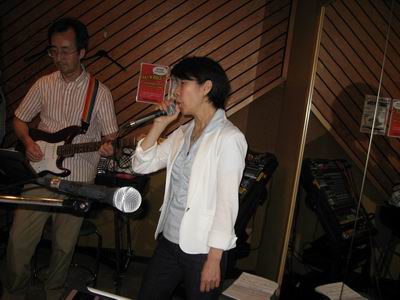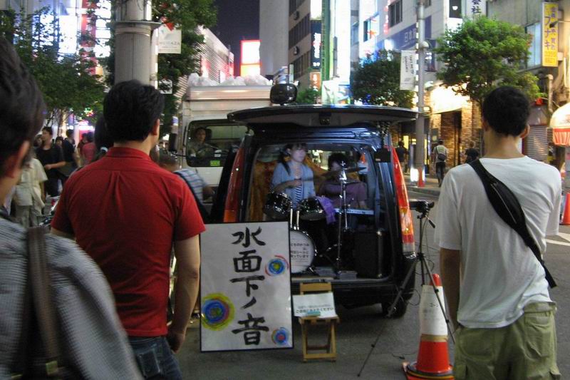 | 帰りに新宿南口の広場で車上ライブをやってた。なんと、軽ボックスの中にドラムセットが・・・ 看板には「水面下ノ音」?バンド名か |